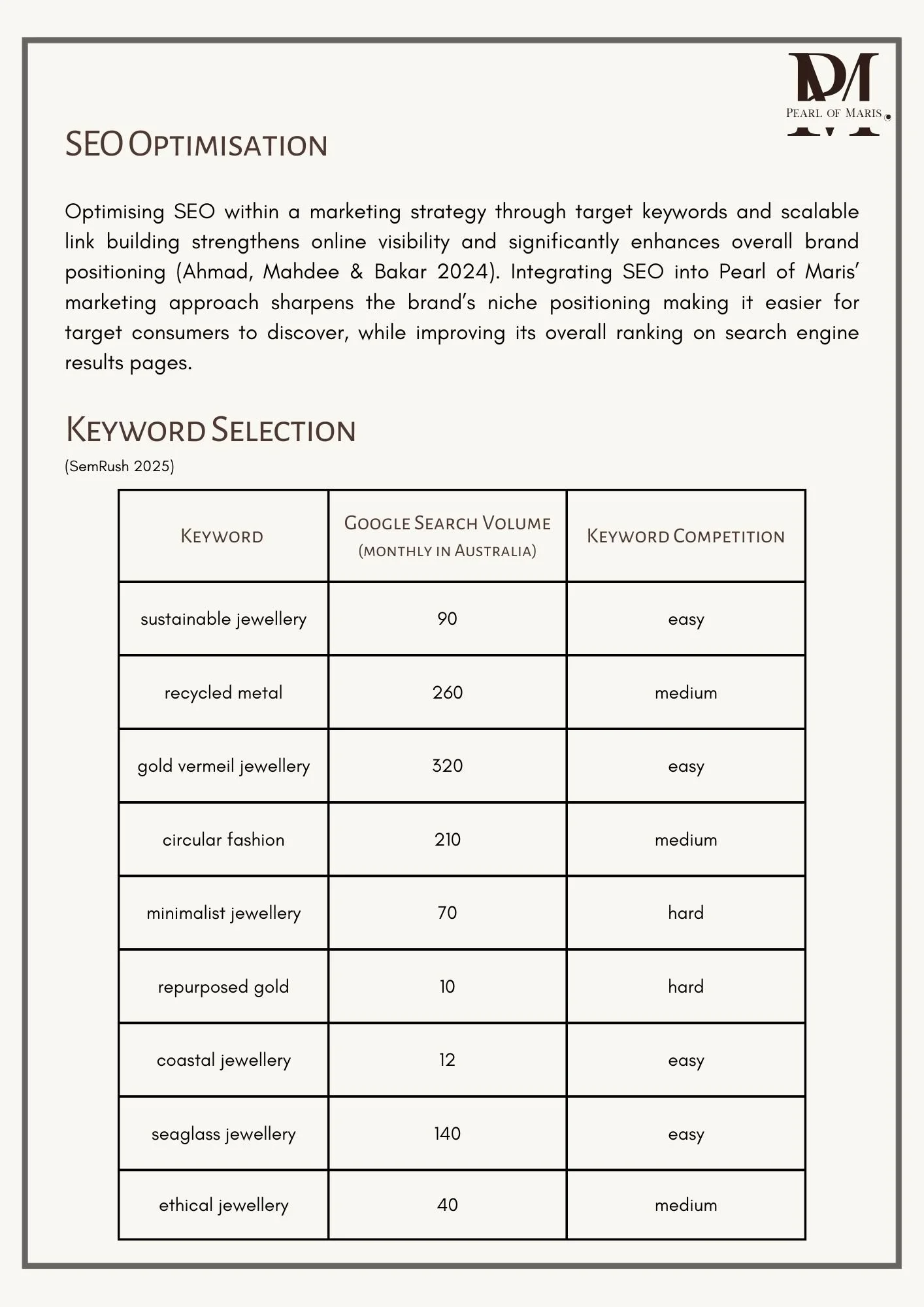 Key skills included product range development, financial analysis, consumer profiling, and integrated marketing communications, with a strong focus on aligning brand values with visual identity. The project delivered a cohesive brand narrative, jewellery range concept, and business plan, supported by a multi-platform marketing strategy designed to guide a considered market entry.
