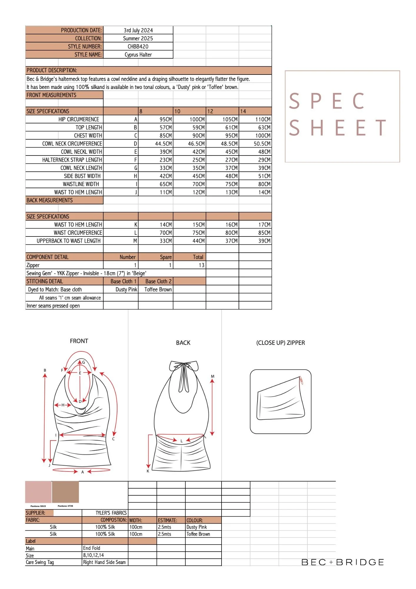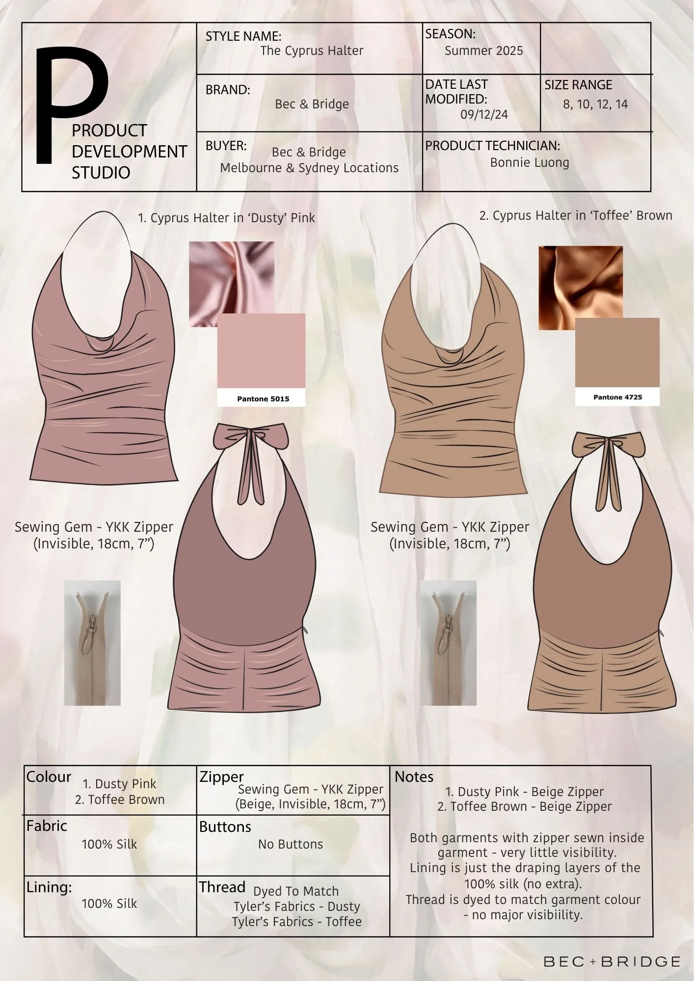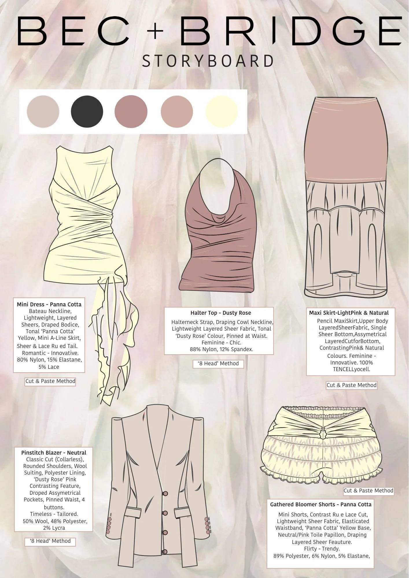 This combined assignment explored two key areas of fashion business, brand profiling and product development. The first component analysed Bec & Bridge’s brand identity, target market, competitive positioning, and marketing strategies, to create a coherent range plan that fits the brand identity. The second component involved the end-to-end development of a new garment, the ‘Cyprus Halter’, detailing its critical path, technical specifications, costing, and production process.